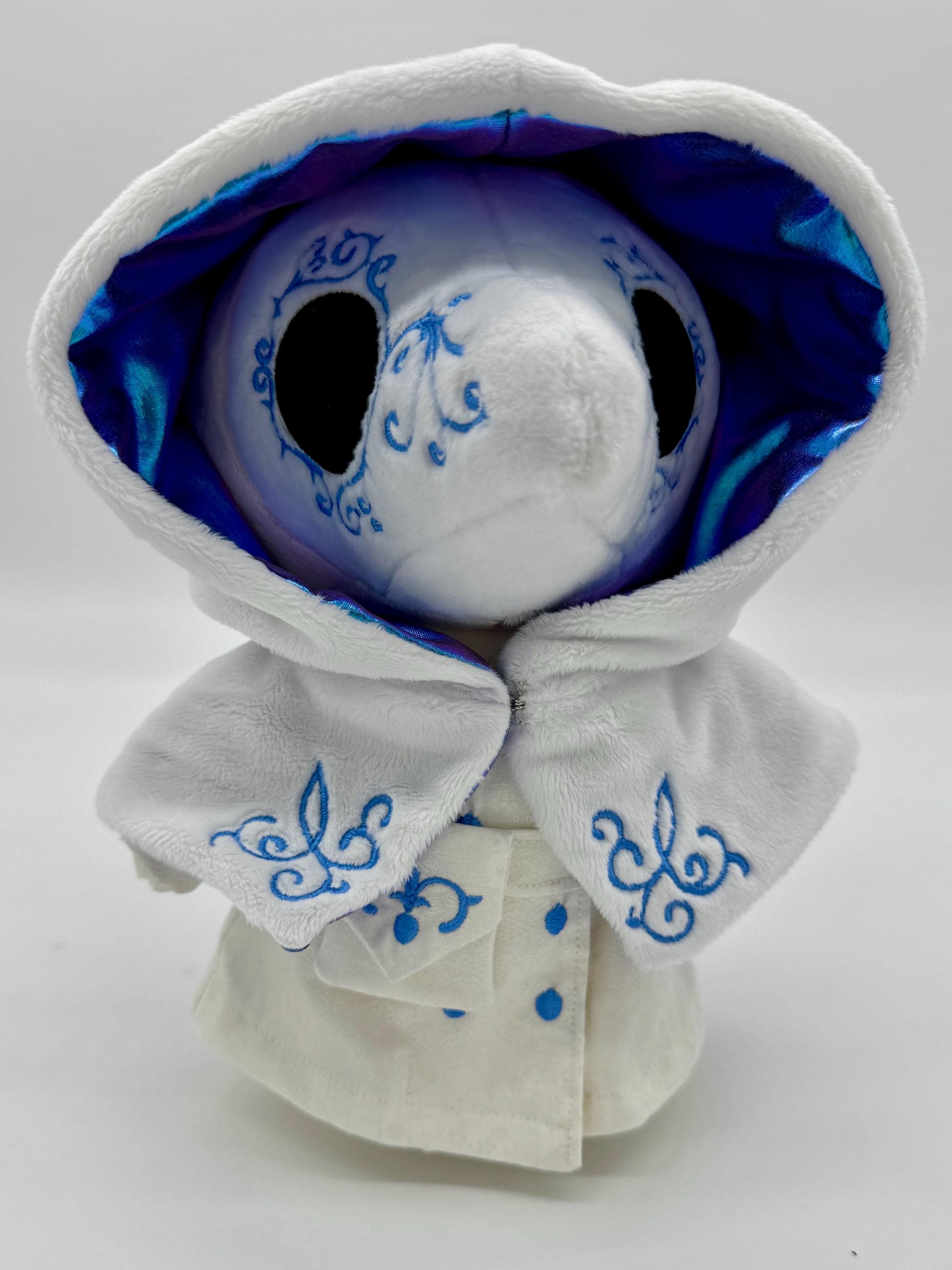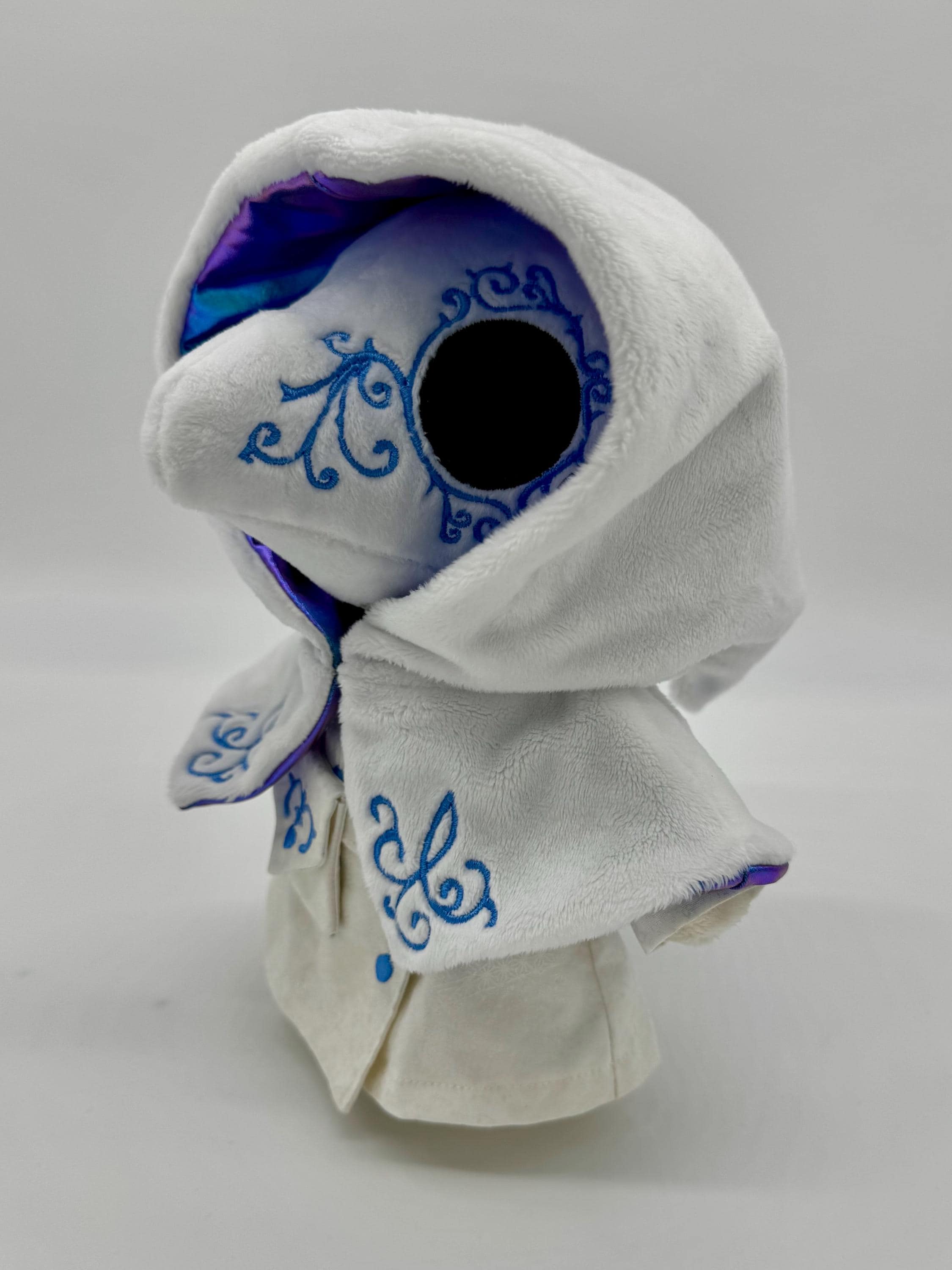 This amazing plague doctor plush is a wonderful cuddly companion or collectable plush for anyone. Made with wonderfully soft materials and an embroidered face and removable clothes it is suitable for children older than three years and adults alike. The plush comes with a 3D printed stand for easy display.