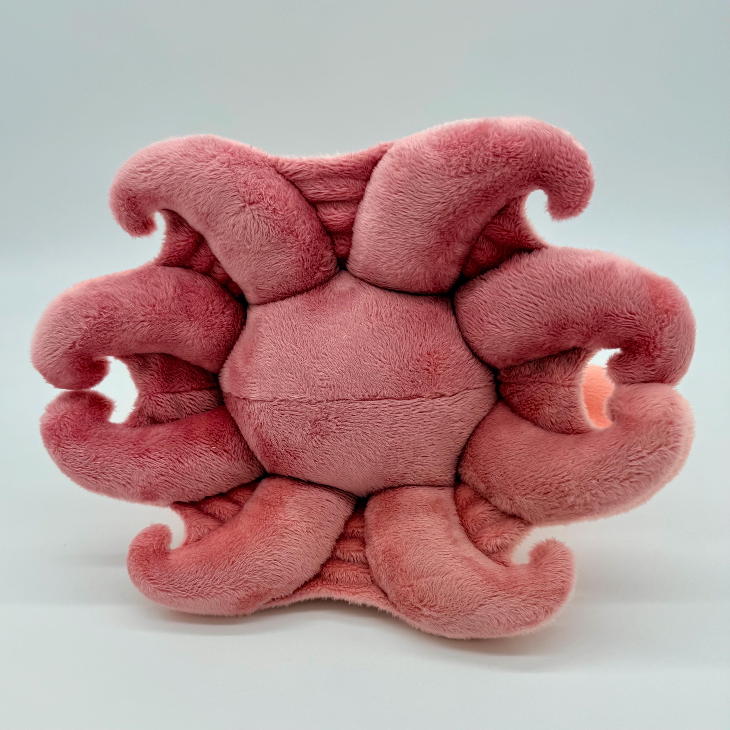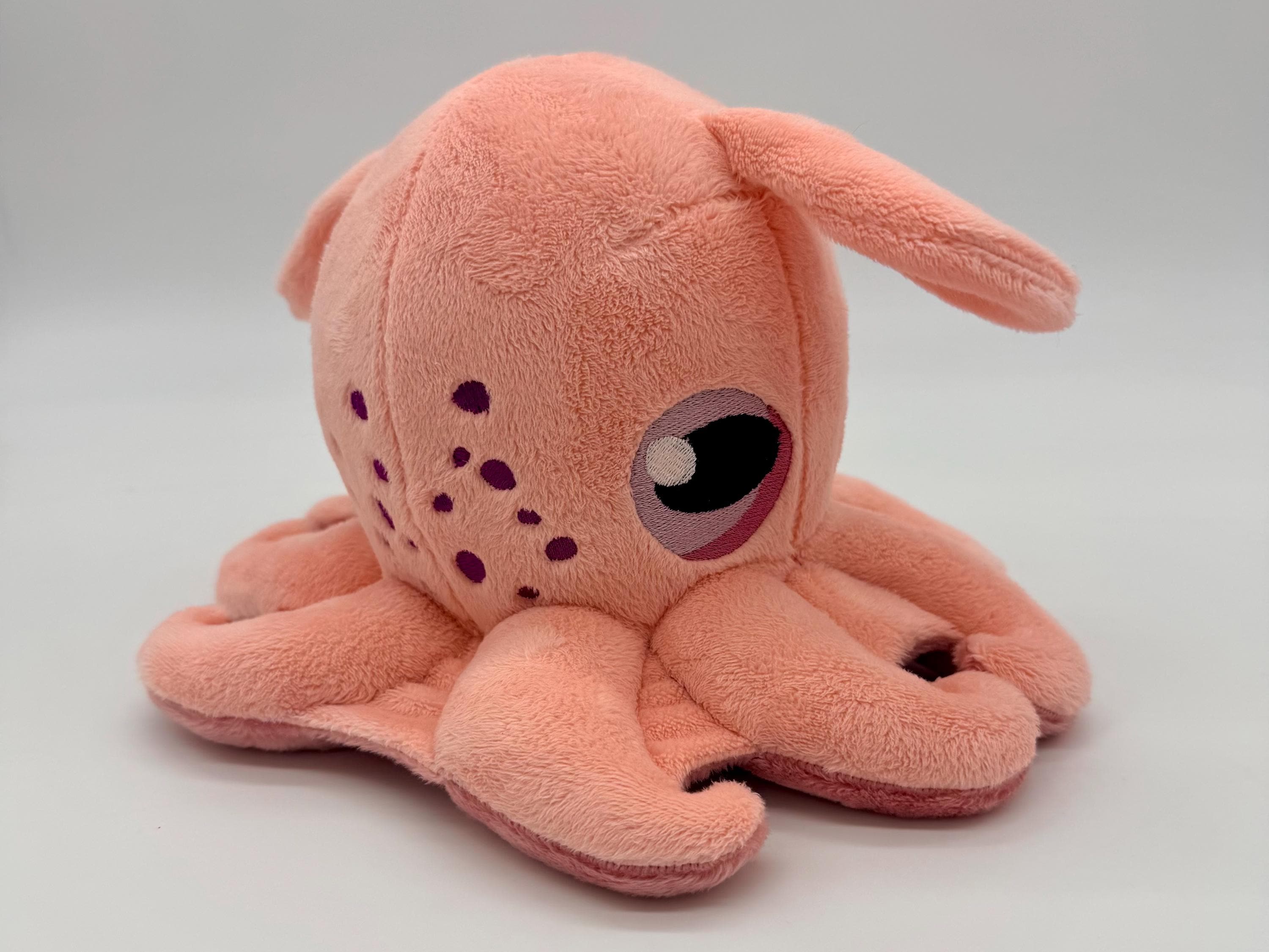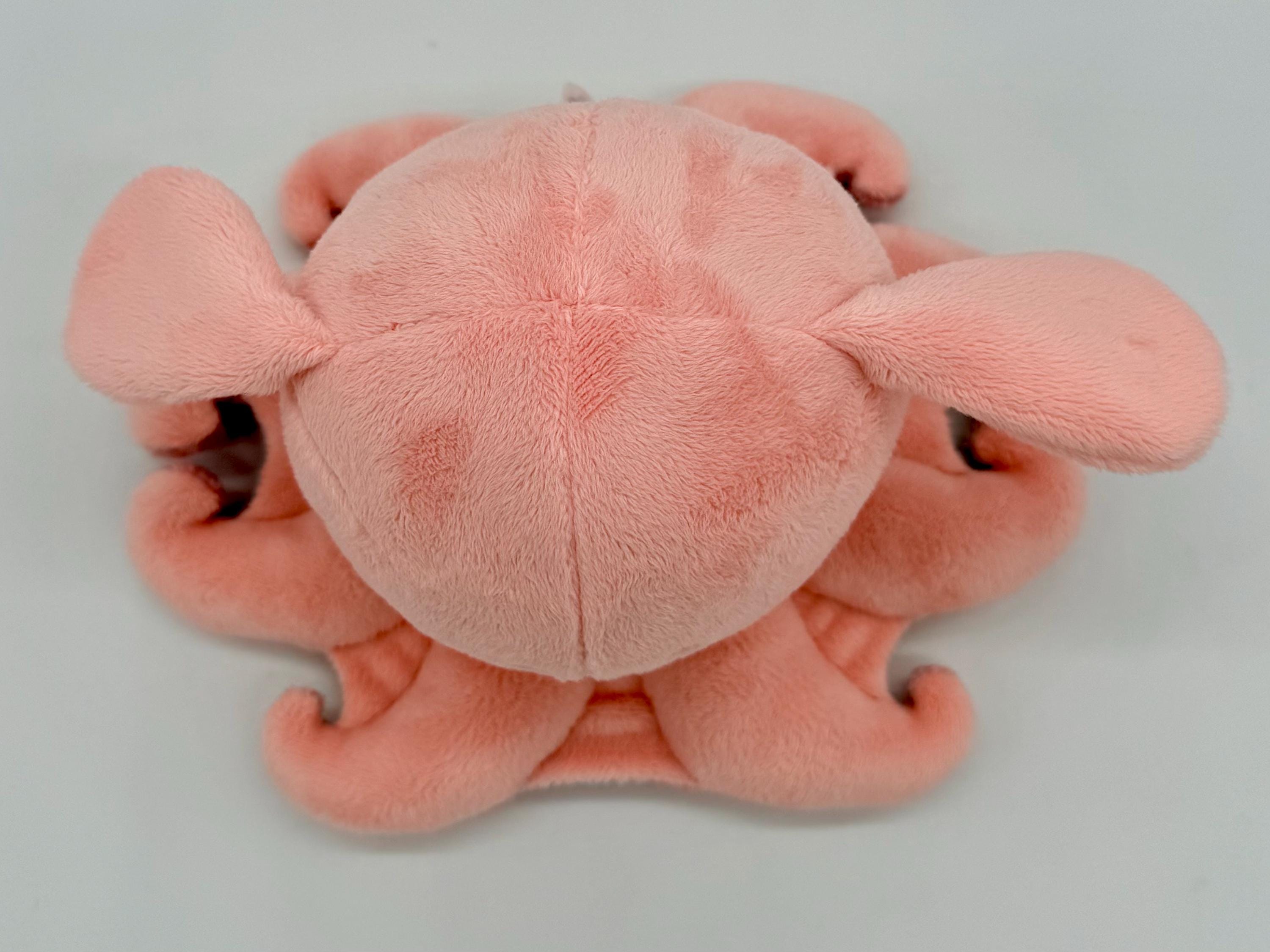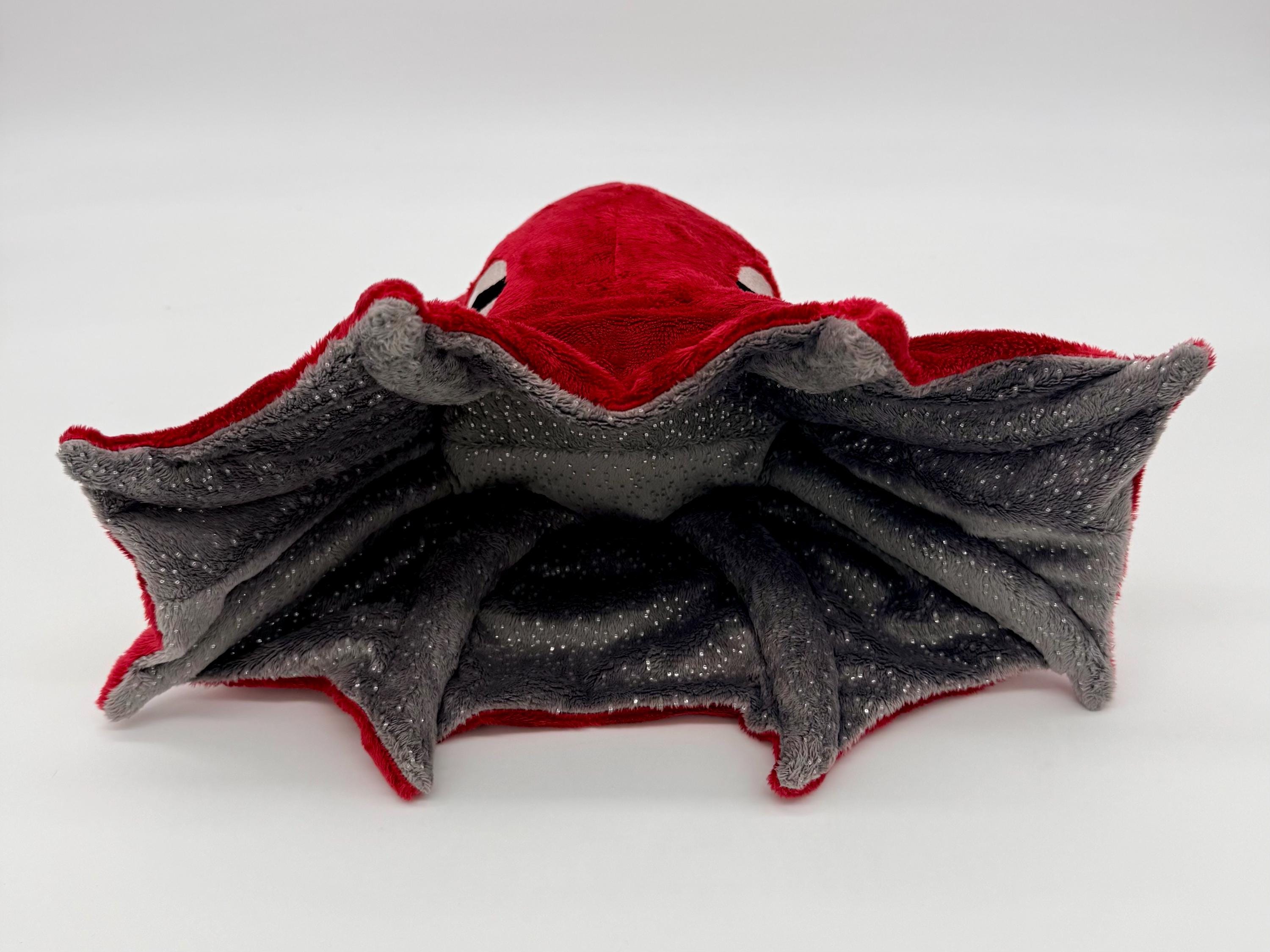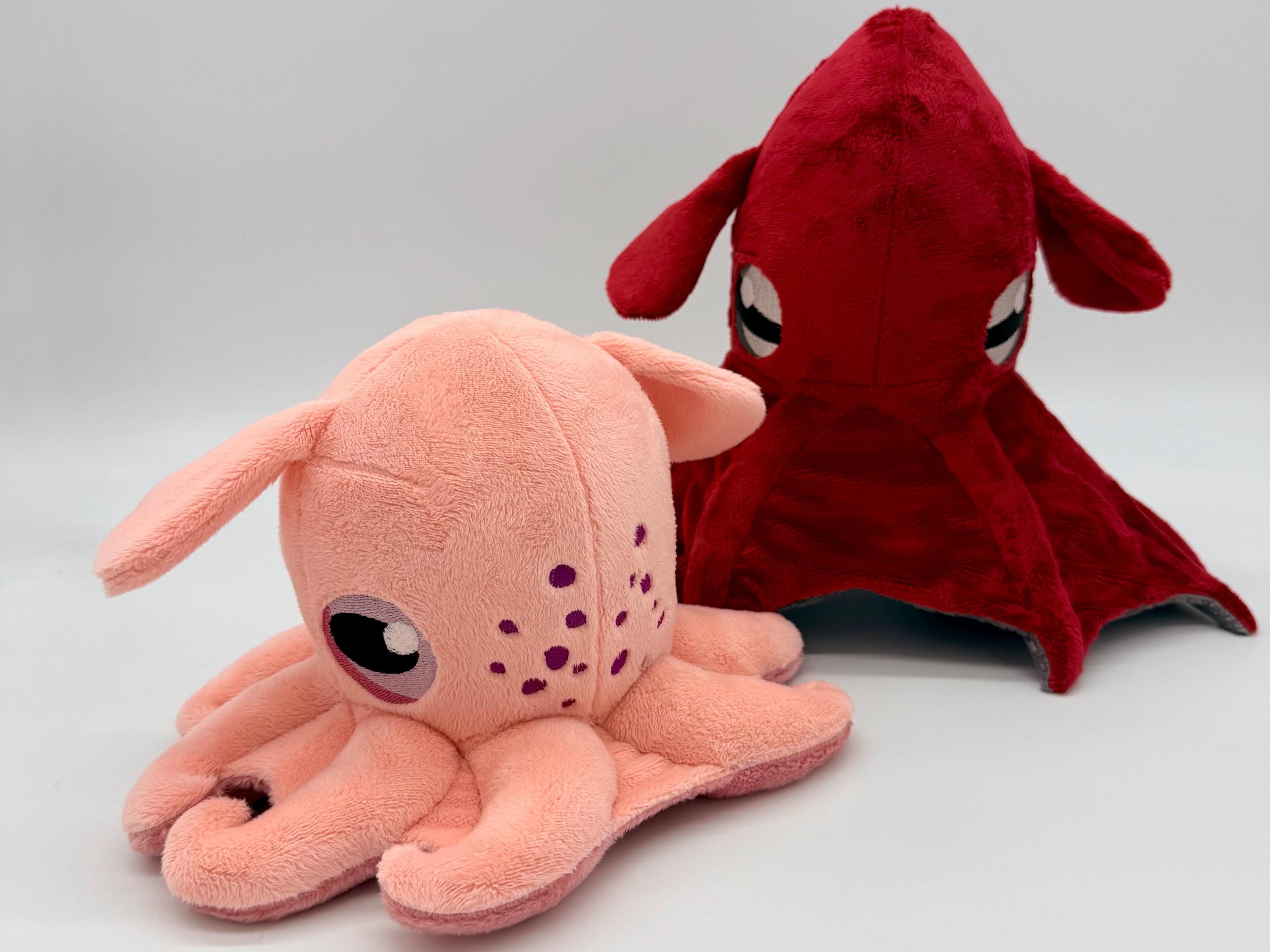 The Vampire Squids head is about 7" tall and 5" wide and 4", the "skirt" is about 14" wide and 11" long, the plush weighs about 9oz. The Dumbo Octopus' head is about 6" tall and 5" wide, the "skirt" is about 8" wide and 9" long, the plush weighs about 7oz.