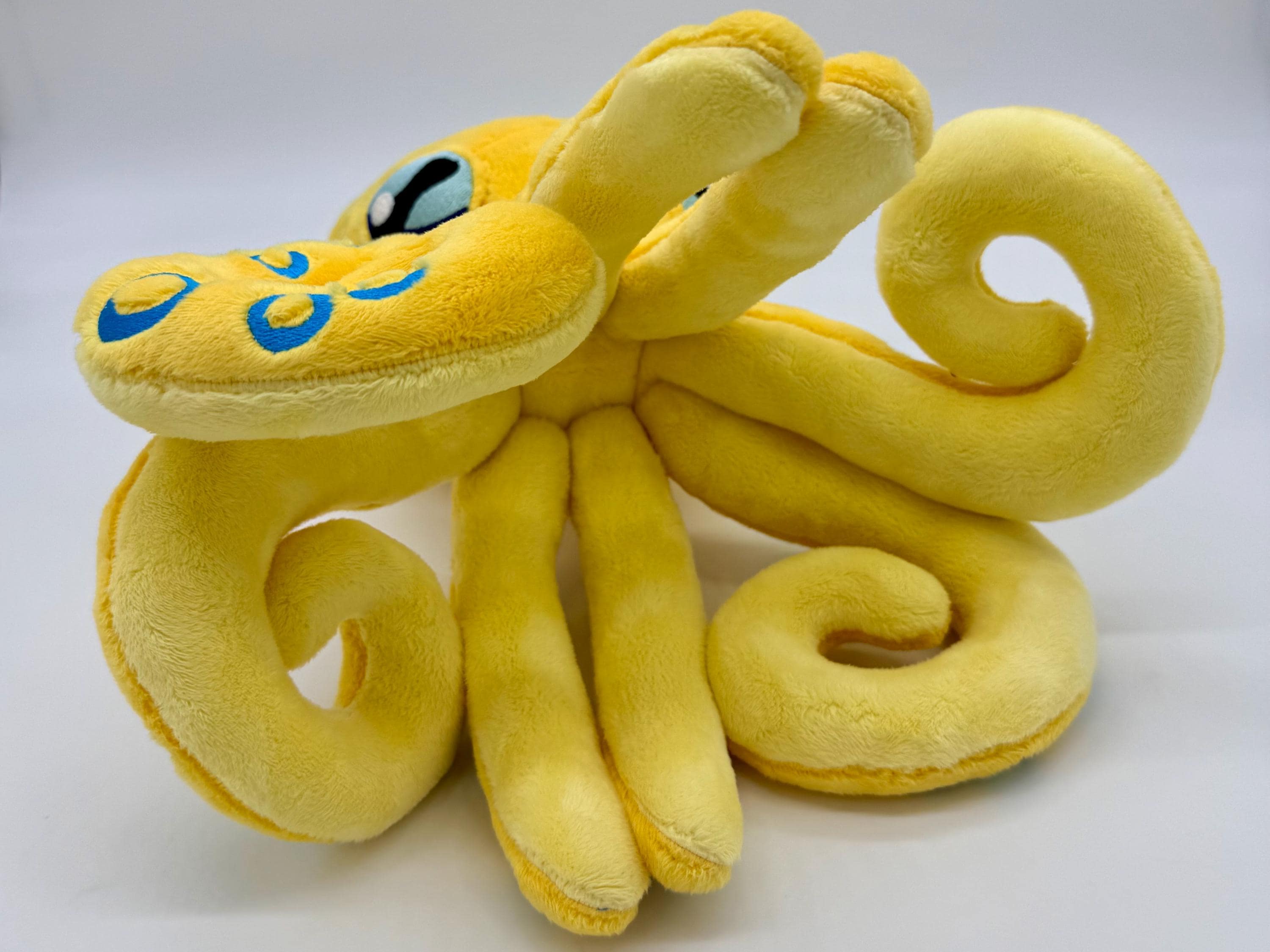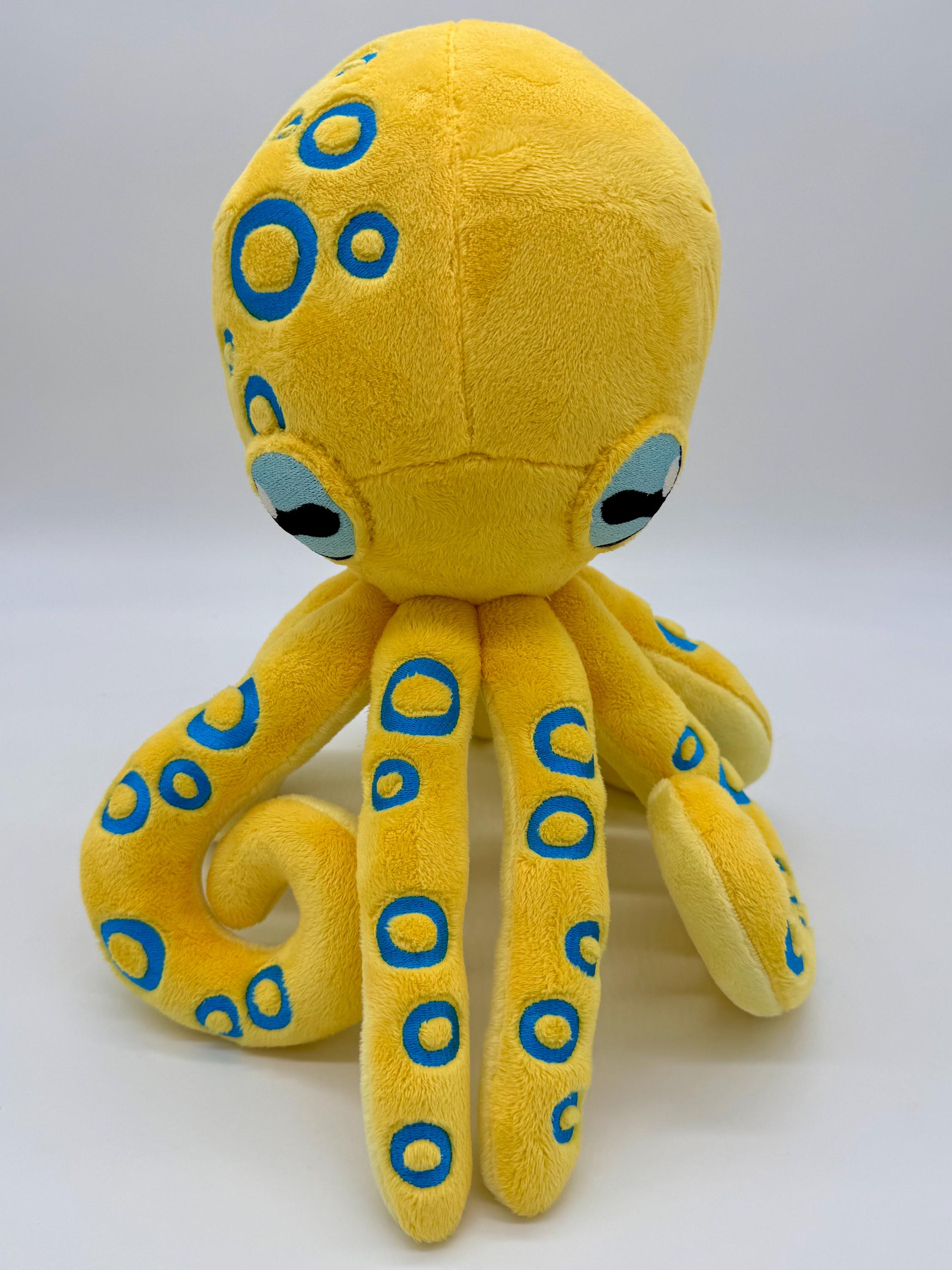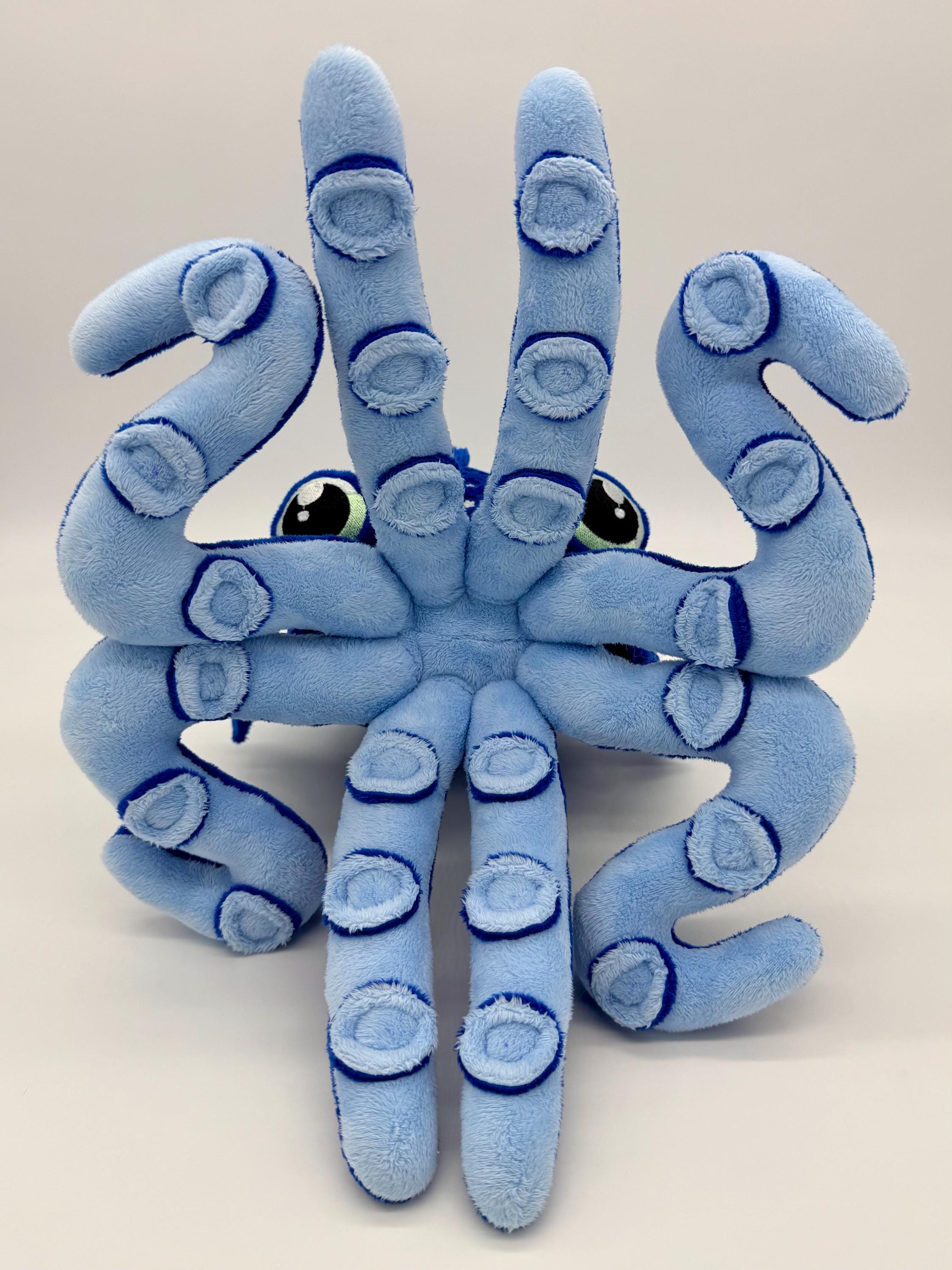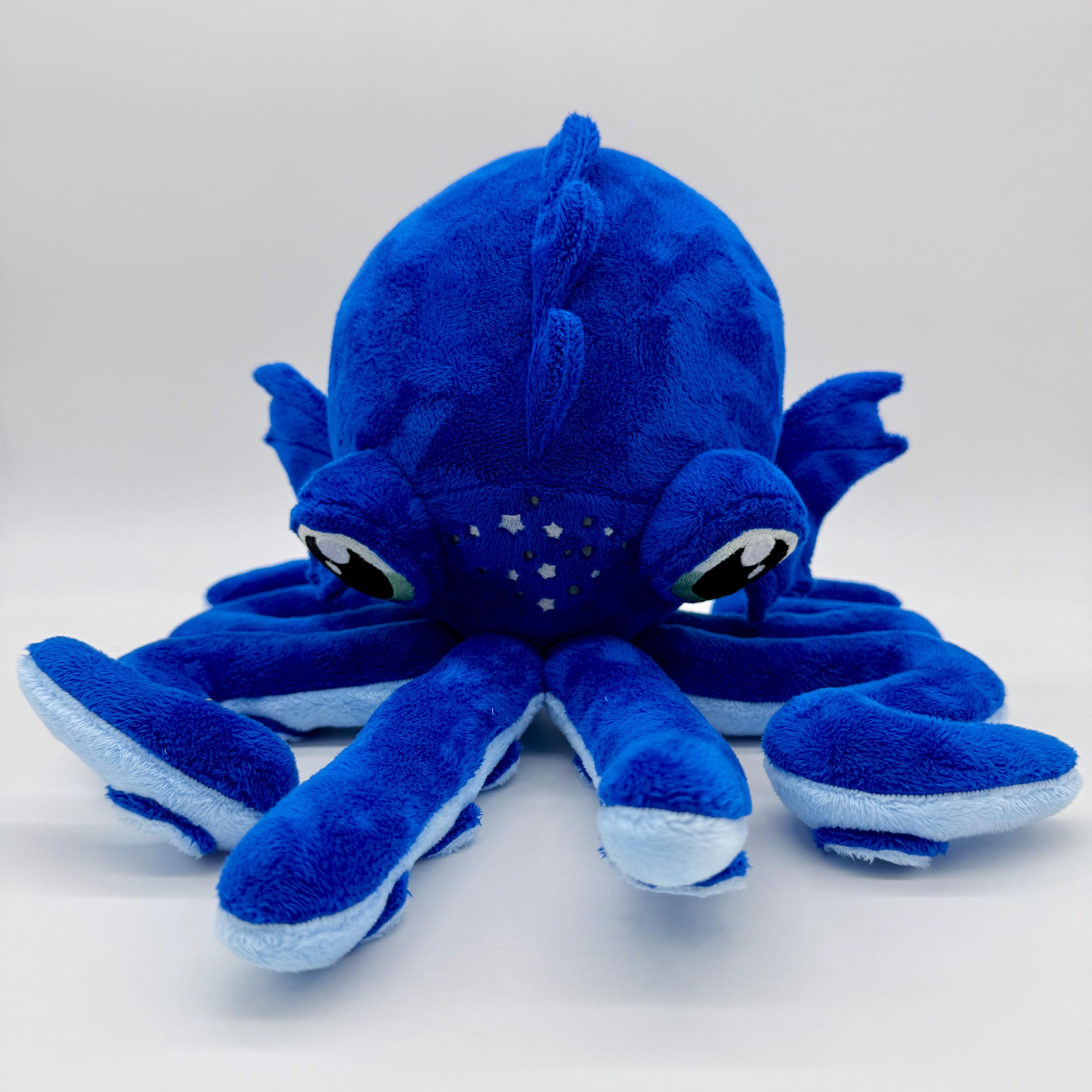 This amazing octopus plush is a wonderful cuddly companion for anyone. Made with wonderfully soft materials and an embroidered face it is suitable for children of all ages and adults alike. Choose between a blue ring octopus, a phantasy inspired octopus with spiked and suckers or a simple octopus with just straight tentacles and minimal embroidery (not pictured).
